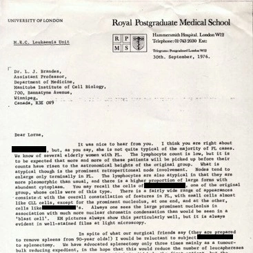 To comply with HIPAA patient privacy requirements and donor restrictions, we have redacted patient identifying information. Digital images of these letters were generously donated by Dr. Lorne J. Brandes, who retains ownership of the original letters.