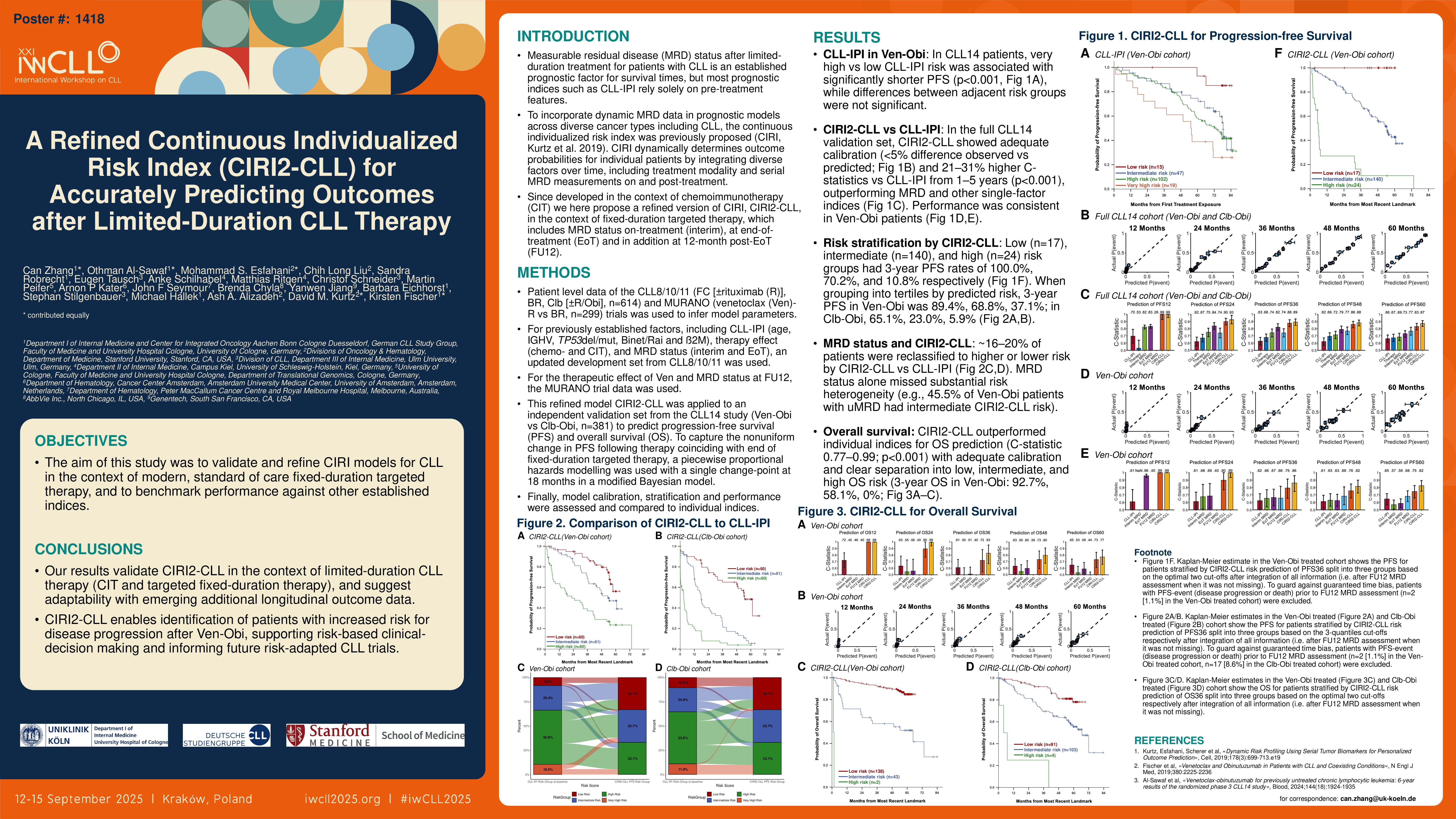 Furthermore, CIRI2-CLL allows for patient stratification according to 3-quantiles (3-year PFS rate from most recent landmark 89.4%, 68.8% and 37.1% respectively in Ven-Obi treated pts, 3-year PFS rate from most recent landmark 65.1%, 23.0% and 5.9% respectively in Clb-Obi treated pts). Nine (19.6%) and 7 (15.6%) pts with intermediate CLL-IPI risk had high CIRI2-CLL risk in the Ven-Obi cohort and Clb-Obi cohort respectively. Nineteen (18.8%) pts in Ven-Obi and 17 (17.5%) pts in Clb-Obi with high CLL-IPI risk had low CIRI2-CLL risk. In the Ven-Obi cohort, 50 (45.5%) of the pts with undetectable ( < 10-4) MRD at FU12 had intermediate CIRI2-CLL risk. In the Clb-Obi cohort, 30 (33.7%) of the pts with detectable MRD at FU12 had low CIRI2-CLL risk.