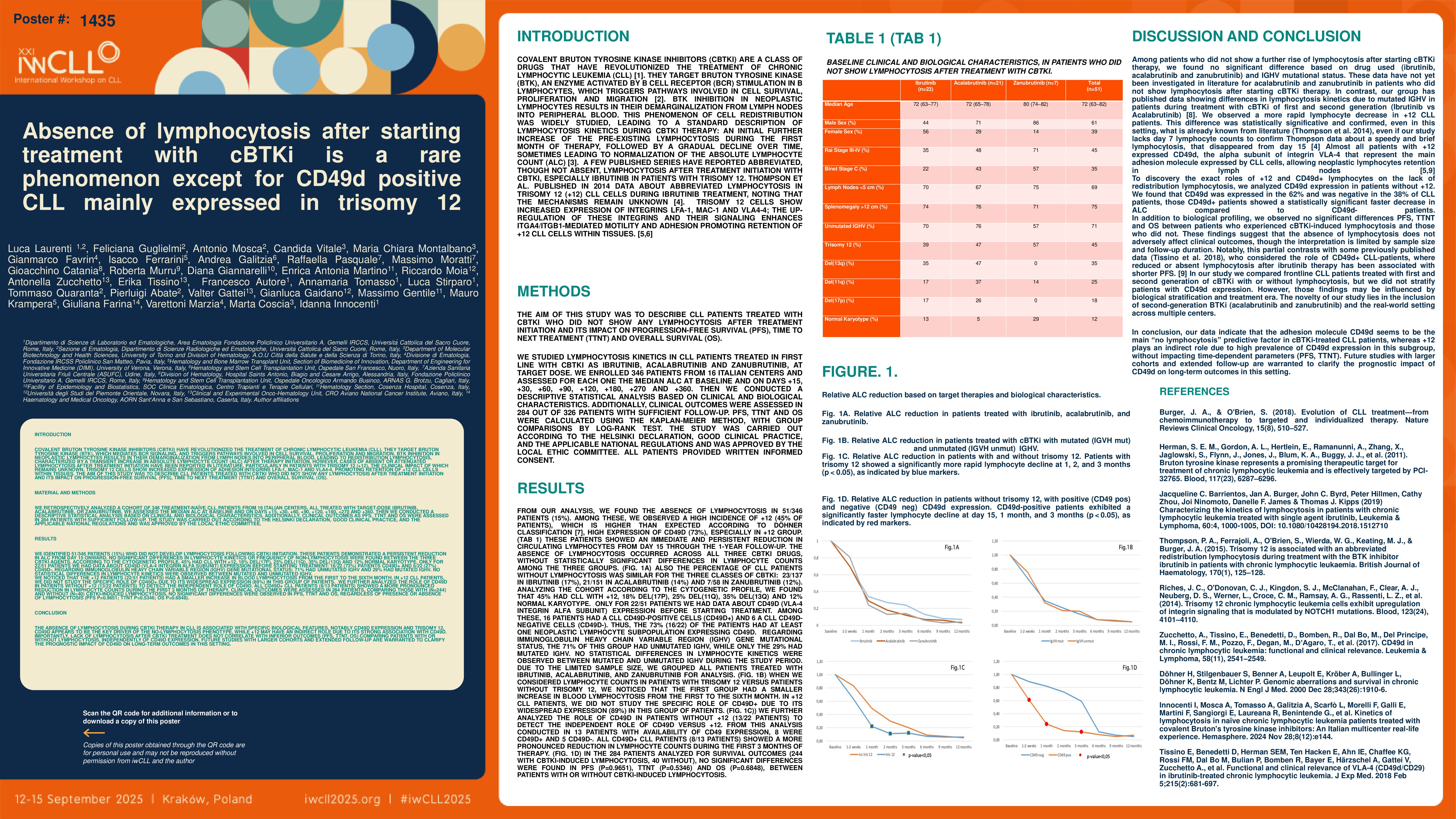 Among patients who didn’t show a further rise of lymphocytosis after starting therapy with cBTKi, we didn’t find any significative difference according to drug employed (Ibrutinib, Acalabrutinib or Zanubrutinib) and IGHV mutational status. However, we observed a more rapid lymphocytosis decrease in trisomy 12 CLL patients. This data was statistically significative on days 15-30-60 and confirmed, even in this setting, what is already known from literature (Thompson et al. 2014). All patients (100%) with trisomy 12 showed a complete or partial CD49d expression. Considering the other patients (not trisomy 12), CD49d was expressed in the 65% and was negative in the 35%, and those patients with a CD49d+/CD49d- bim CLL showed a faster decrease in ALC, statistically significative on days 15-30-90, than those ones with a CD49d- CLL. In conclusion, our data suggest that the adhesion molecule CD49d seems to be the main “no lymphocytosis” predictive factor in patients on treatment with cBTKi.