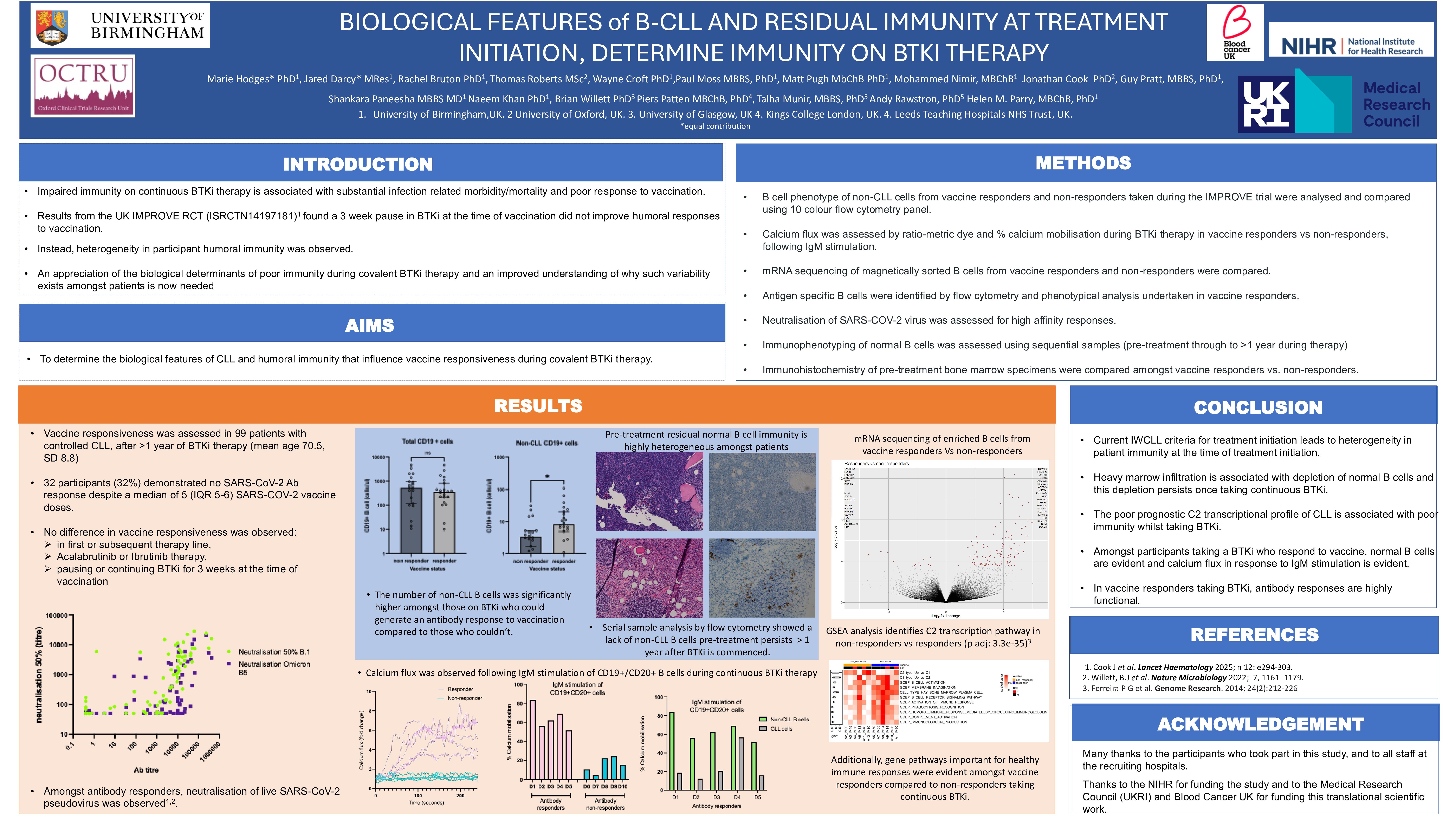 Using participant samples from IMPROVE, immunophenotyping of peripheral blood B cells was undertaken in vaccine responders versus non-responders to identify CLL and non-CLL B cell phenotype, followed by detection and phenotypic analysis of antigen-specific B cells amongst responders. Calcium flux analysis following IgM stimulation, along with mRNA sequencing of detectable B cells in antibody responders versus non-responders, was next investigated. An assessment of pre-treatment bone marrow samples by immunohistochemistry was also performed. Finally, serial immunophenotypic analysis of peripheral blood samples from therapy initiation to >1 year on BTKi were used to corroborate findings and the association with infection admission risk assessed.