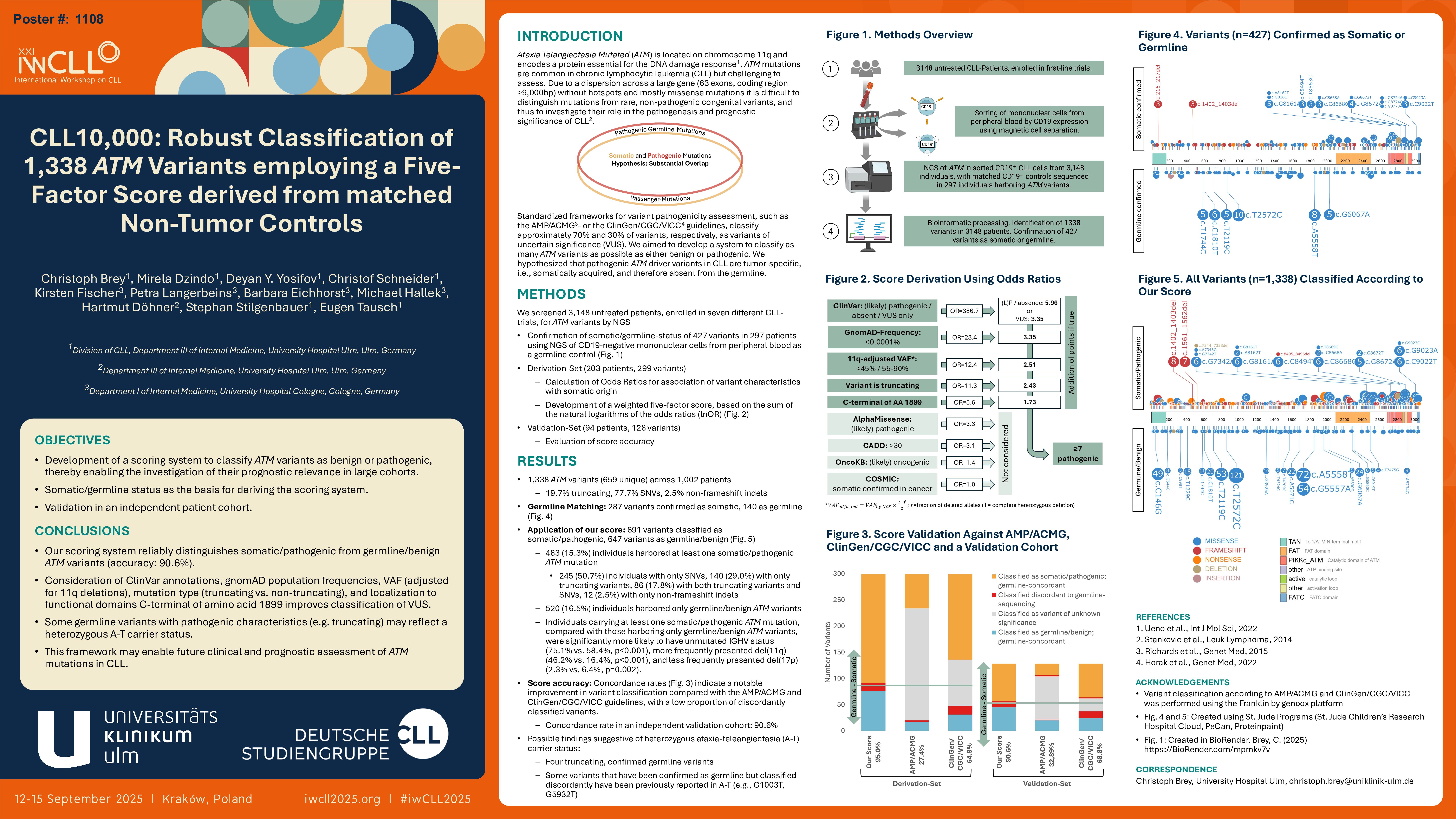 We herein present a scoring system that reliably identifies pathogenic ATM variants and may facilitate the investigation of their prognostic impact in CLL across large cohorts. Independent validation will be performed in an additional patient cohort with matched non-tumor controls. In parallel, efforts will be made to complete the genetic landscape of ATM mutations and to assess the co-occurrence of other relevant markers. Associations with specific clinical and molecular factors will also be investigated.