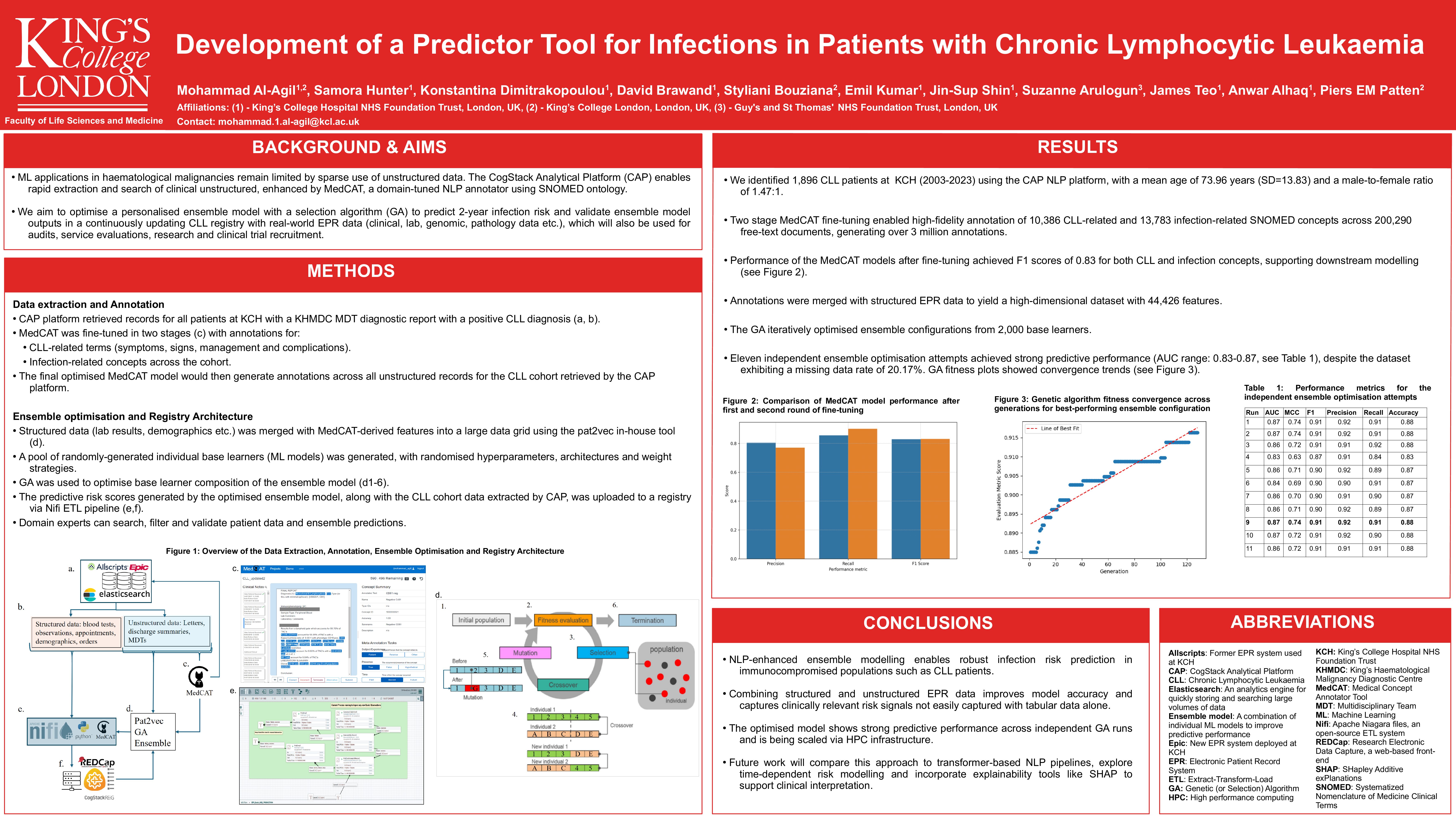 Using the CogStack natural language processing (NLP) platform, 1,896 CLL patients (2003 – 2023) were identified at King’s College Hospital. MedCAT was fine-tuned in two stages: (1) to detect CLL-related concepts (10,386 SNOMED terms) and (2) to identify infections (13,783 terms), producing high-fidelity annotations from 200,290 unstructured documents. Structured variables and NLP-derived features were processed via the pat2vec module. A selection algorithm (SA) optimised ensemble configurations from 2,000 base learners including tree-based, boosting, and neural models to predict 2-year infection risk, using varied hyperparameters and ensemble weighting strategies.