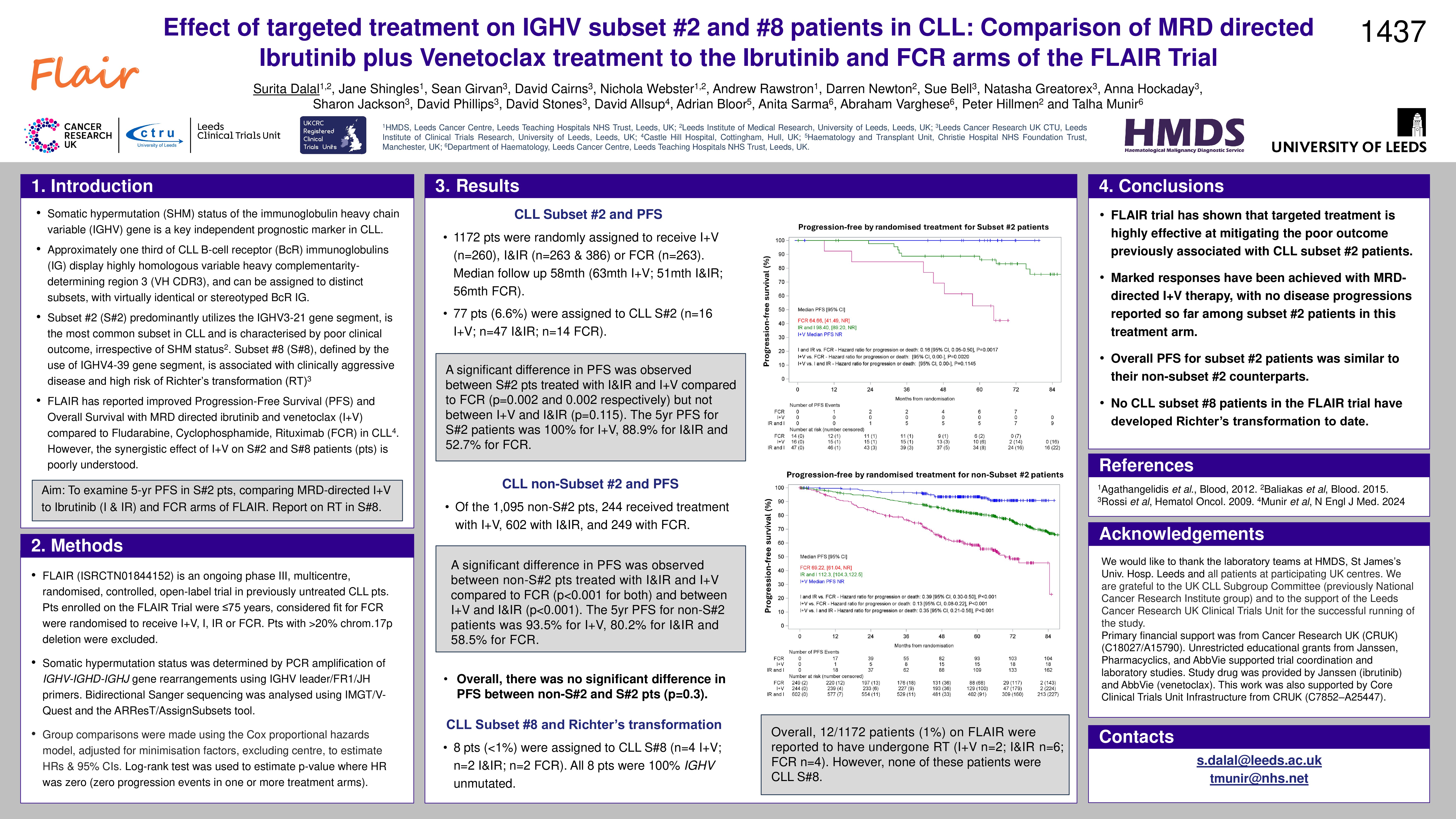 Determination of the immunoglobulin heavy variable (IGHV) gene somatic hypermutation (SHM) status remains an important and independent prognostic marker in CLL. Additionally, in approximately one third of CLL the B-cell receptor (BcR) immunoglobulins (IG) display highly homologous variable heavy complementarity-determining region 3 (VH CDR3), and can be assigned to distinct subsets, with virtually identical or stereotyped BcR IG. Of the major subsets described, CLL subset #2 is the largest stereotyped subset (Agathangelidis et al, Blood. 2012). Present in CLL using the IGHV3-21 gene, this subset is characterised by poor clinical outcome, irrespective of SHM status (Baliakas et al, Blood. 2015). Stereotyped CLL subset #8, defined by the use of the IGHV4-39 gene, is associated with clinically aggressive disease and high risk of Richter’s transformation (RT) (Rossi et al, Hematol Oncol. 2009). Compared to chemoimmunotherapy, numerous trials using targeted treatment strategies with Ibrutinib (I) an irreversible Btk inhibitor, and Venetoclax (V), a Bcl-2 inhibitor have shown improved outcomes in CLL. FLAIR has reported improved Progression-Free Survival (PFS) and Overall Survival with MRD defined I+V compared to Fludarabine, Cyclophosphamide and Rituximab (FCR) in CLL (Munir et al, N Engl J Med. 2024). However, little is known regarding the synergistic effect of I+V on the response of subset #2 and #8 patients.