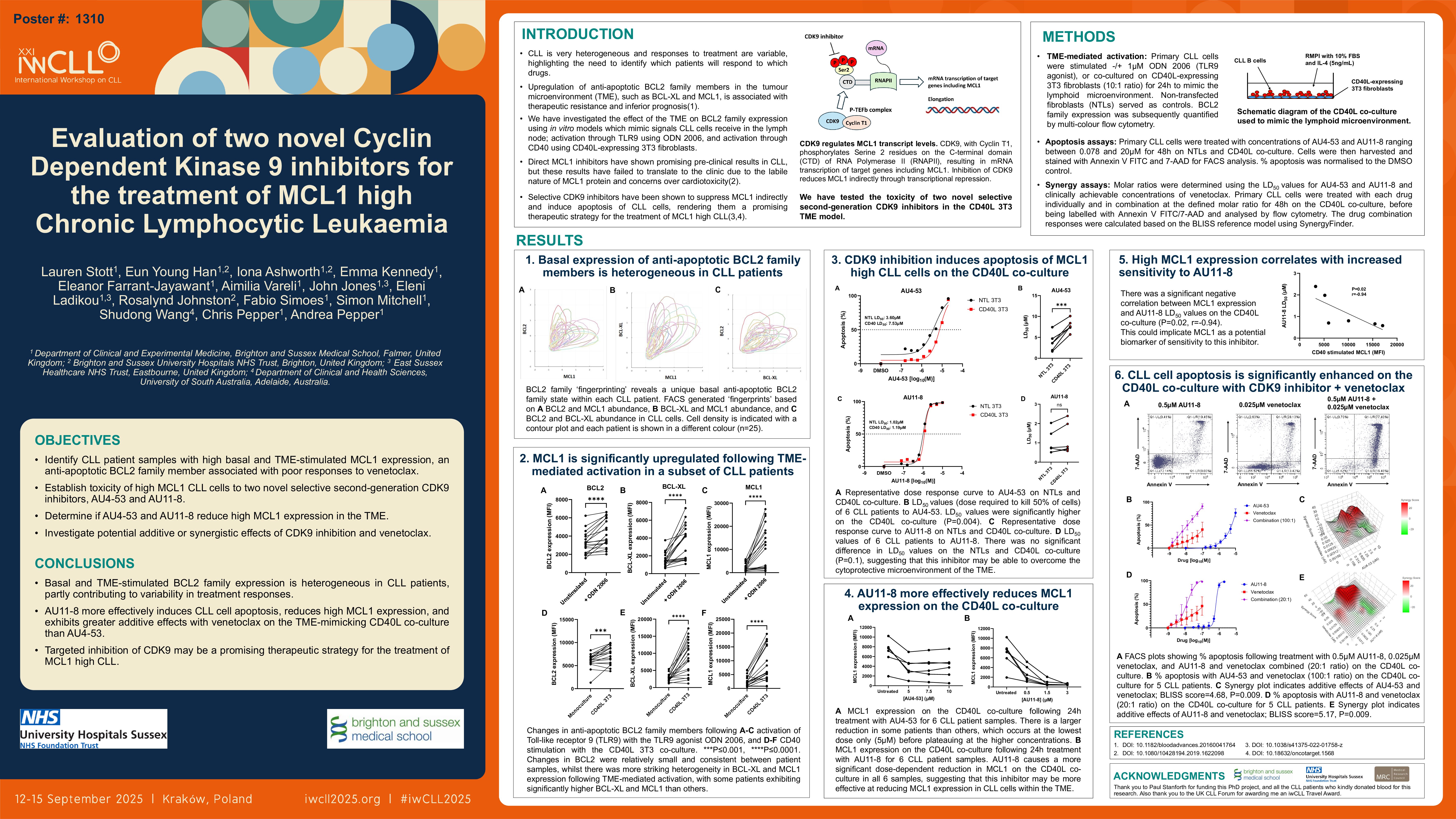 In all six primary CLL samples tested, the CDK9 inhibitors AU4-53 and AU11-8 effectively induced apoptosis of MCL1 high CLL cells on the CD40L co-culture, indicating their potential to overcome the cytoprotective lymphoid microenvironment. CLL cells most sensitive to AU11-8 had greater MCL1 expression (P=0.02, r=-0.94), implicating MCL1 as a potential biomarker of sensitivity to this inhibitor. Both AU4-53 and AU11-8 caused a dose-dependent reduction in MCL1 protein expression on the CD40L co-culture in all three primary CLL samples tested so far, and preliminary data suggests that both inhibitors may show potential to synergise with venetoclax under these cytoprotective conditions.