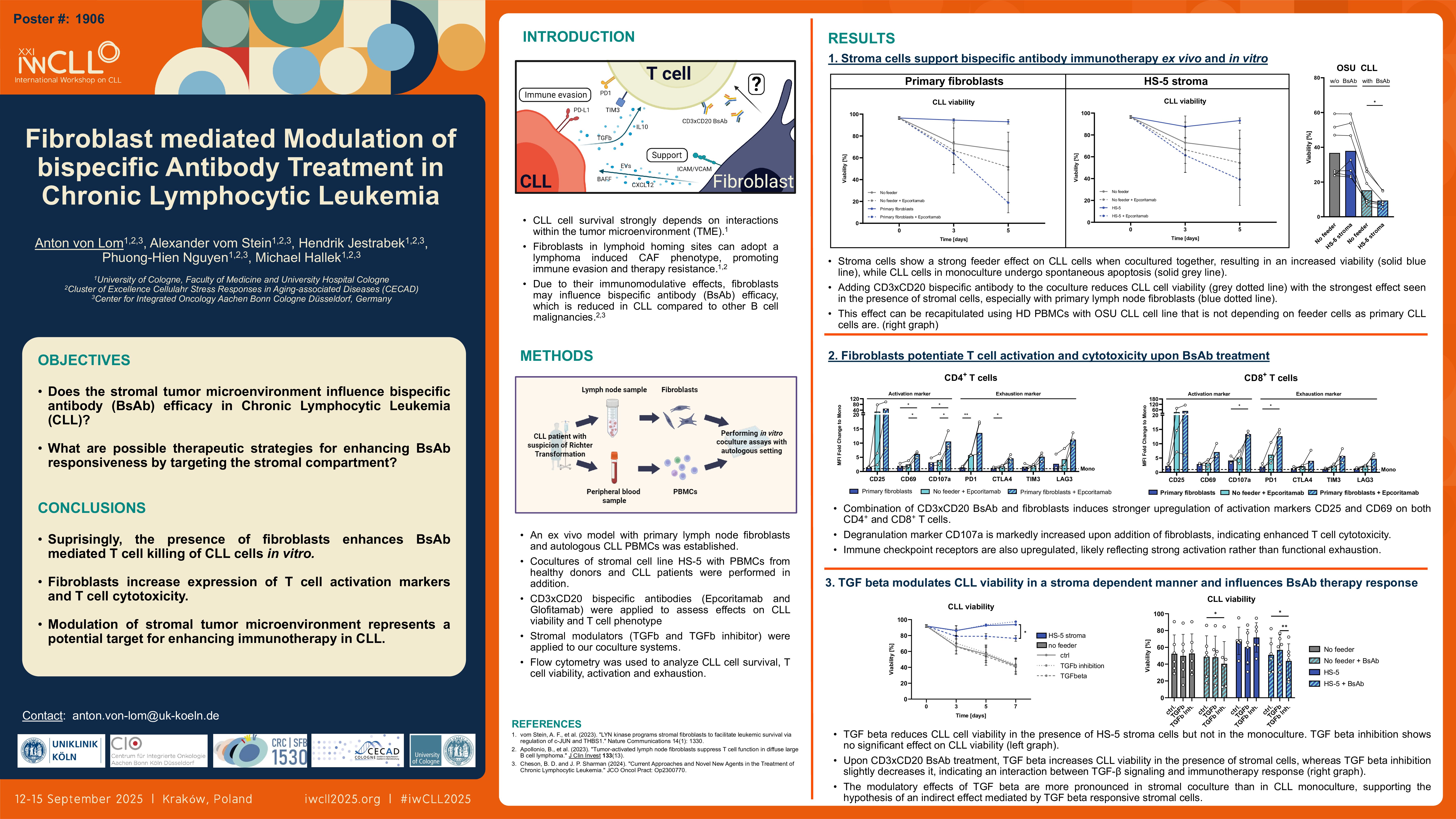 In vitro coculture assays were established using stromal cell lines and peripheral blood mononuclear cells (PBMC) from healthy donors and CLL patients. CD3/CD20 BsAbs and stromal modulators were applied, and effects on CLL cell viability and T cell phenotype including activation and exhaustion markers were assessed via flow cytometry. Additionally, an ex vivo coculture system using patient-derived lymph node fibroblasts and autologous CLL cells was developed.