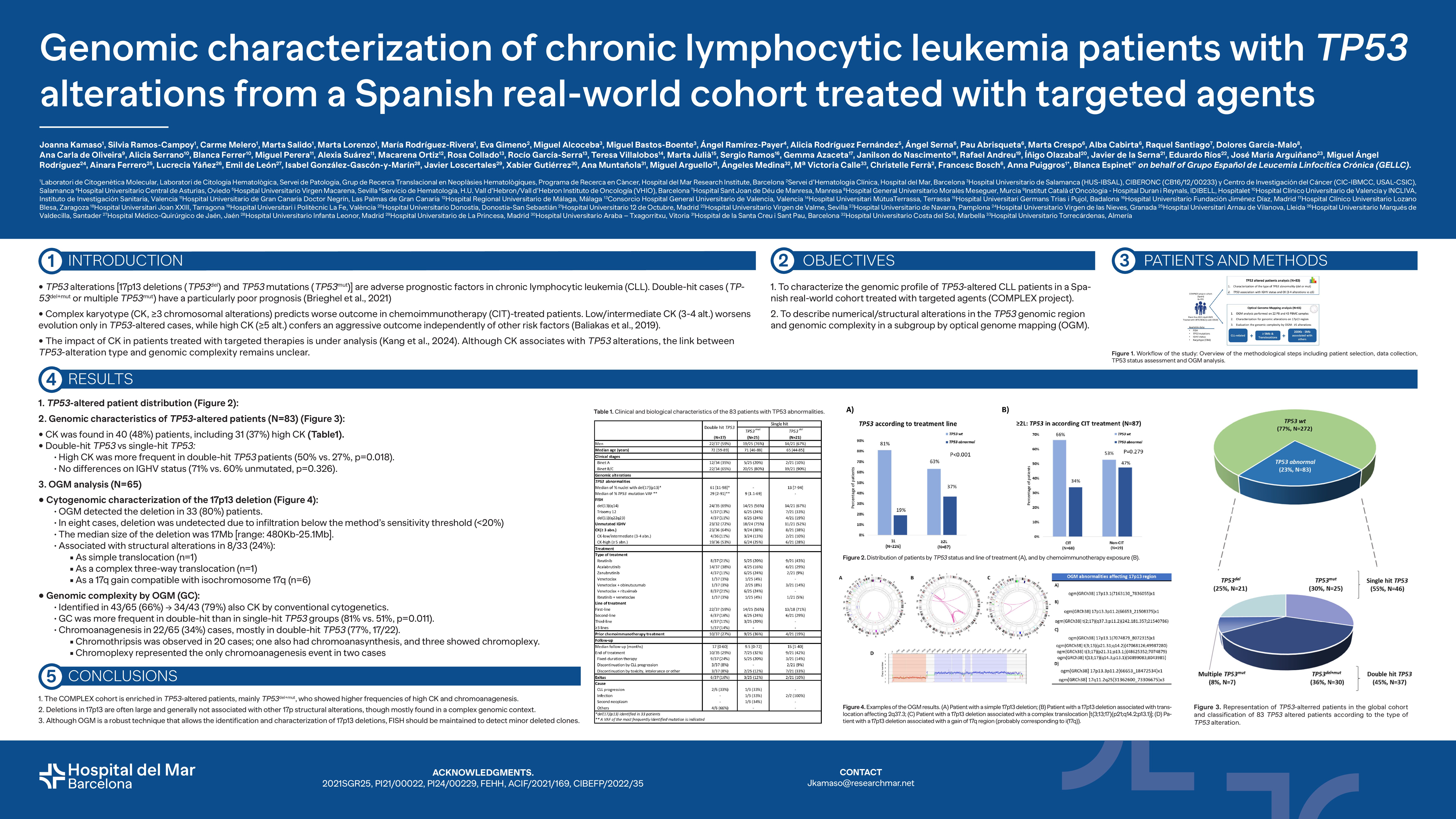 Whitin the context of the COMPLEX project, which aims to assess the impact of CK on the outcome of CLL patients treated with targeted therapies in a real-life study in Spain, the main aims of this study were: (1) To characterize the genomic profile of TP53-altered patients and (2) To describe numerical/structural alterations in the TP53 genomic region and genomic complexity in a subgroup of cases using OGM.