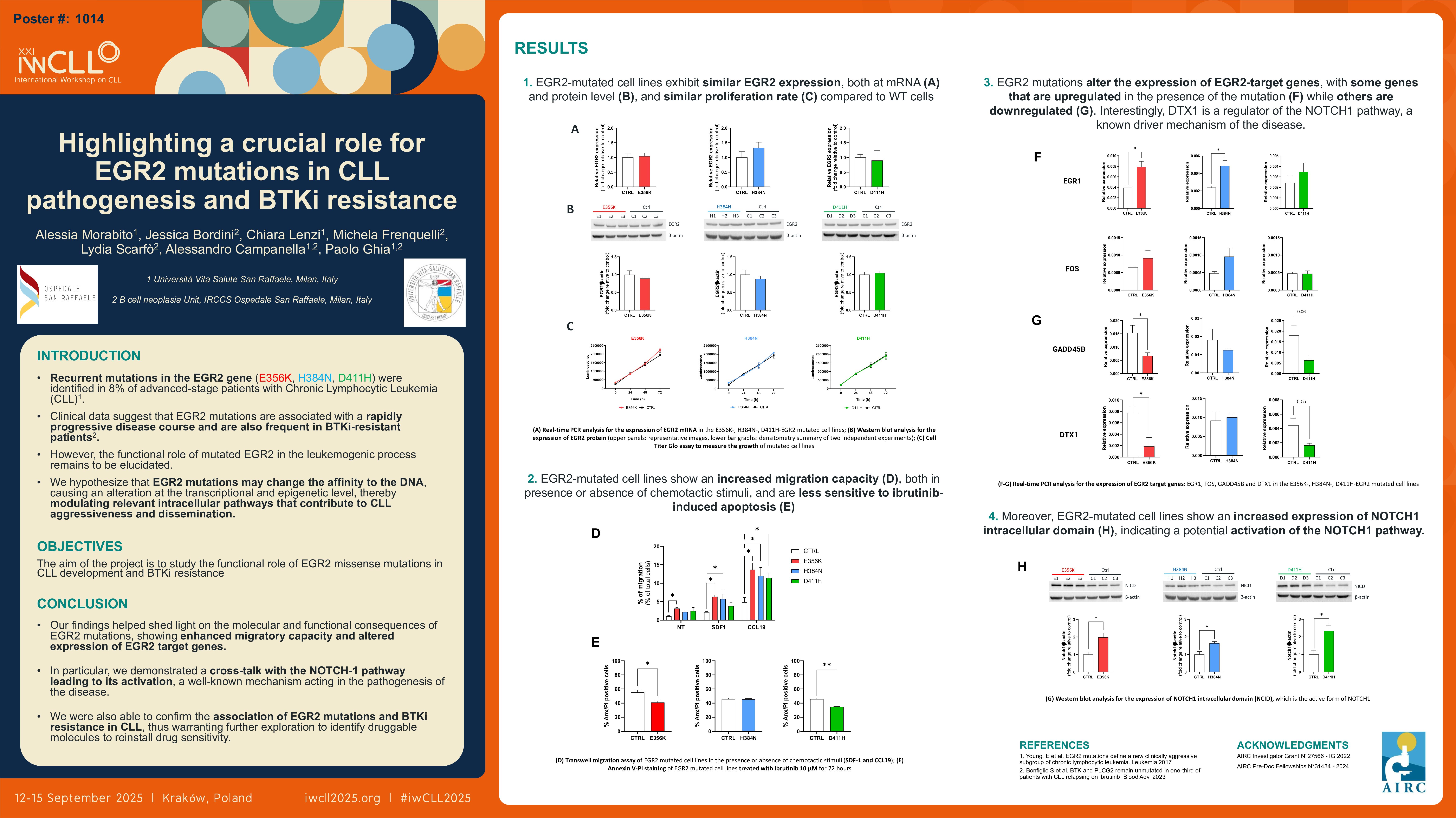 We engineered the MEC-1 CLL cell line using CRISPR/Cas9 technology to generate EGR2-mutated cells, selectively harboring each of the three recurrent missense mutations found in patients: E356K, H384N, and D411H. We analyzed the effect of EGR2 mutations by studying in vitro cell proliferation, transwell migration in the presence or absence of chemokines, expression of EGR2 target genes, and sensitivity to the BTK inhibitor Ibrutinib.