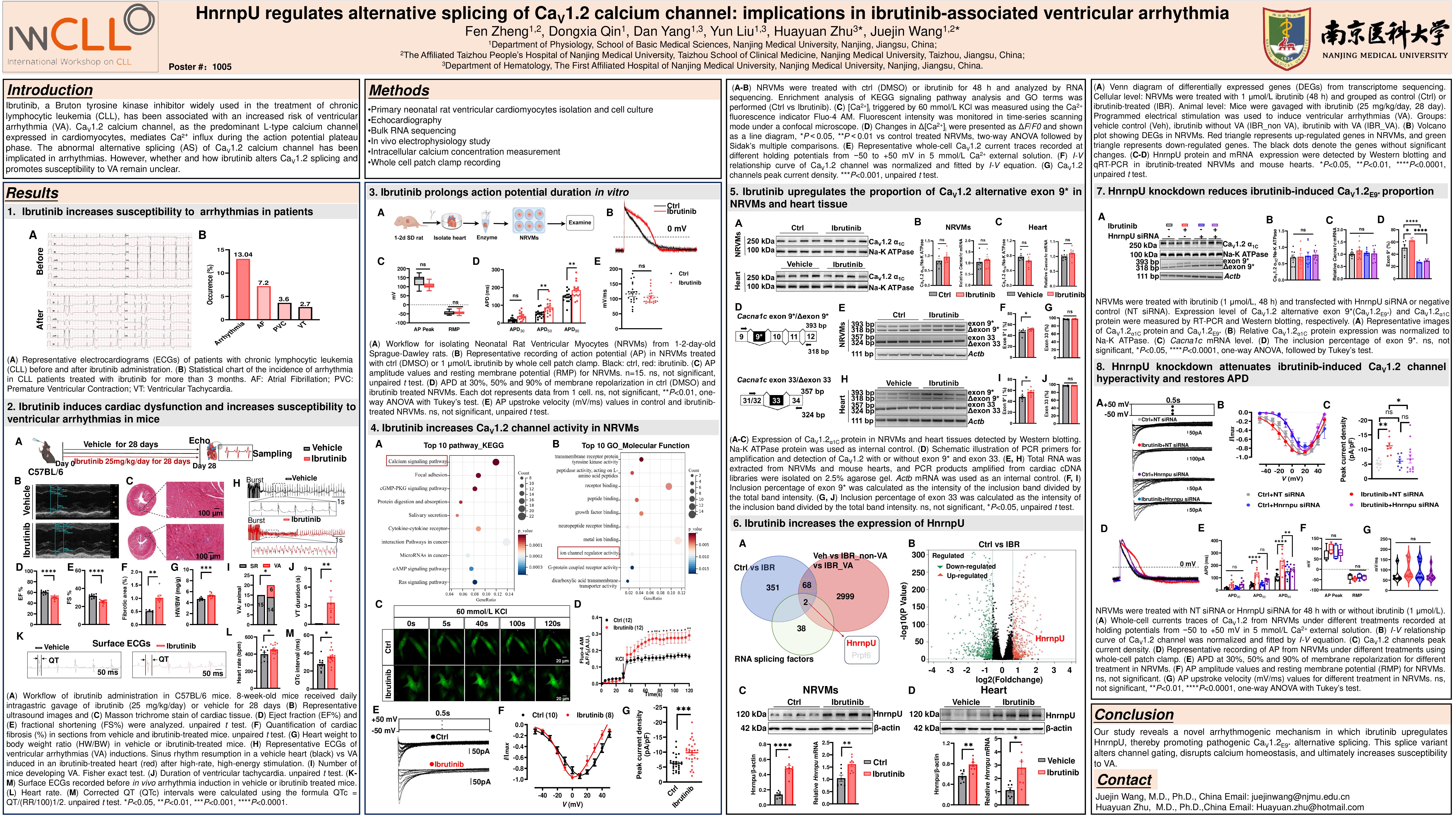 76 CLL patients meeting the inclusion criteria were analyzed, and statistical analysis demonstrated that ~13% of these patients developed cardiac arrhythmias including VA after three months of continuous ibrutinib therapy. In mice, 4 weeks ibrutinib administration increases the susceptibility to ventricular arrhythmias to 30%. Bulk RNA sequencing revealed that ibrutinib significantly altered calcium signaling pathway and induced AS of Cacna1c. Indeed, ibrutinib increased the expression of the CaV1.2 alternative exon 9* (CaV1.2E9*) without affecting alternative exon 33. In NRVMs, ibrutinib hyperpolarized the current-voltage curve of cardiac CaV1.2 channels, prolonged APD, and raised K+-triggered [Ca2+]i. By using transcriptomics analysis, the splicing factor hnRNPU was found to be upregulated by ibrutinib treatment. RIP assay confirmed the direct binding of hnRNPU to CaV1.2 pre-mRNA. Knockdown of hnRNPU significantly reduced CaV1.2E9* expression, reversed the hyperpolarization trend of the CaV1.2 channel currents, and mitigated APD prolongation induced by ibrutinib.