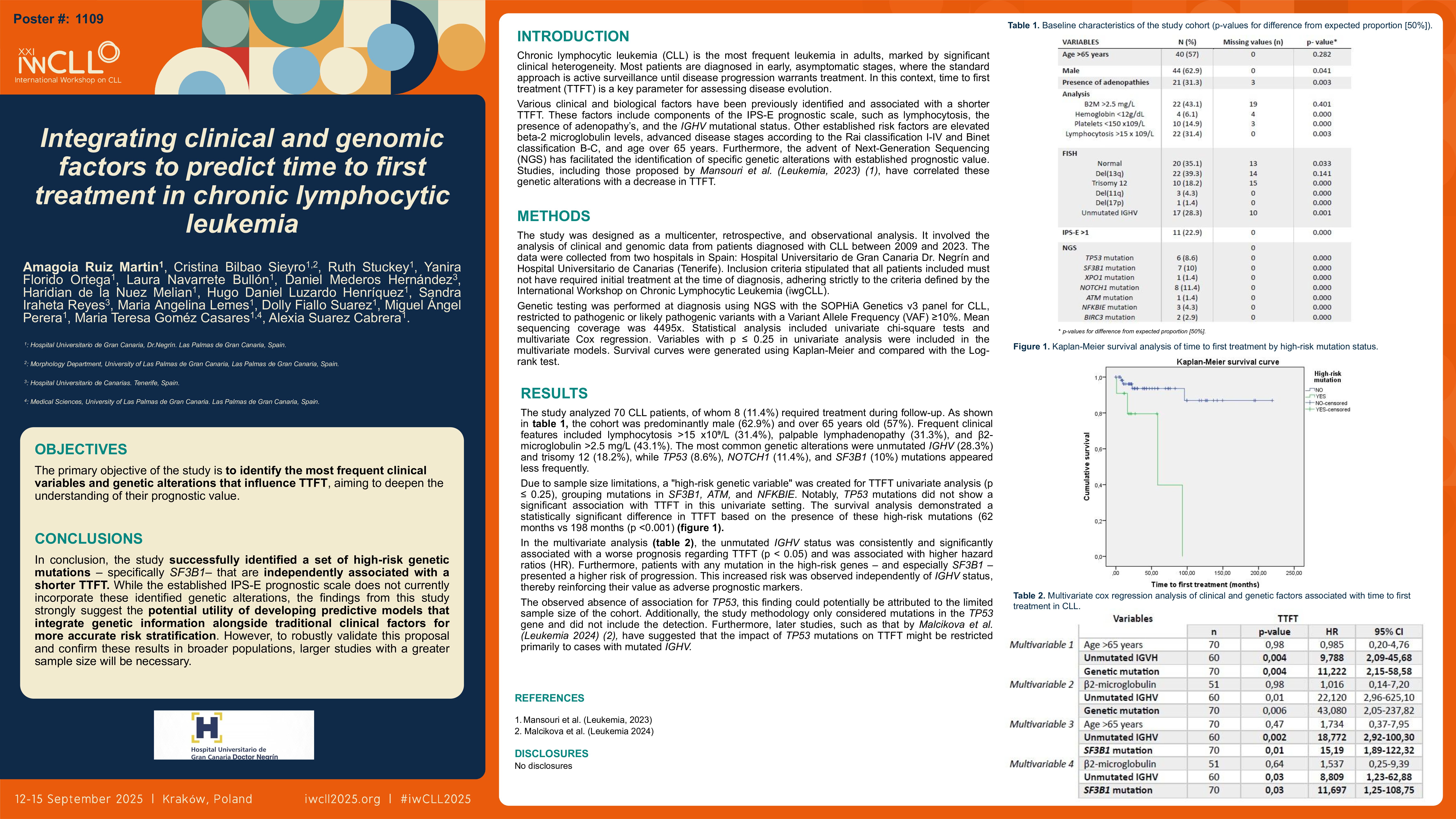 Various clinical and biological factors have been previously identified and associated with a shorter TTFT. These factors include components of the IPS-E prognostic scale, such as lymphocytosis, the presence of adenopathy’s, and the IGHV mutational status. Other established risk factors are elevated beta-2 microglobulin levels, advanced disease stages according to the Rai classification I-IV and Binet classification B-C, and age over 65 years. Furthermore, the advent of Next-Generation Sequencing (NGS) has facilitated the identification of specific genetic alterations with established prognostic value. Studies, including those proposed by Mansouri et al. (Leukemia, 2023), have correlated these genetic alterations with a decrease in TTFT. Given this background, the primary objective of the study described in the sources was to identify the most frequent clinical variables and genetic alterations that influence TTFT, aiming to deepen the understanding of their prognostic value.