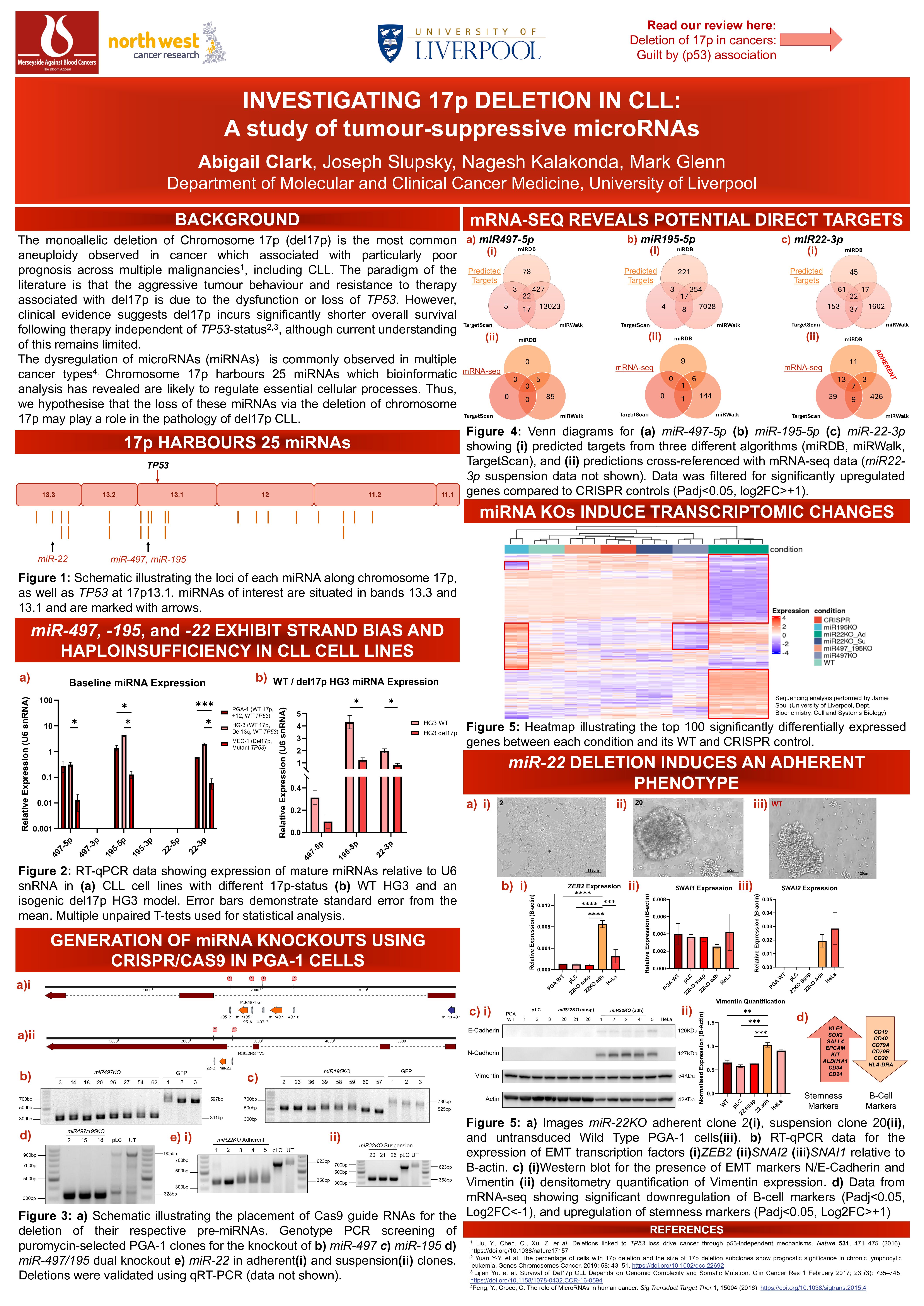 Chromosome 17p is particularly gene-rich, and, in addition to ~350 protein-coding genes, there exist multiple non-coding elements including 25 genes encoding microRNAs (miRNAs/miRs), which were of particular focus in this research. miRNAs are small non-coding RNA transcripts ranging from 19-22 nucleotides, which regulate the expression of multiple target genes via mRNA interference, and their dysregulation in cancers is becoming increasingly recognised across multiple malignancies (reviewed in (Reddy, 2015)). To the best of our knowledge, prior to this study, no work has been published regarding the function of 17p-derived miRNAs in the context of B-cell malignancies. The aim of this work is to explore the roles of some of these miRNAs, and how their loss via del17p may contribute to poor patient prognosis.