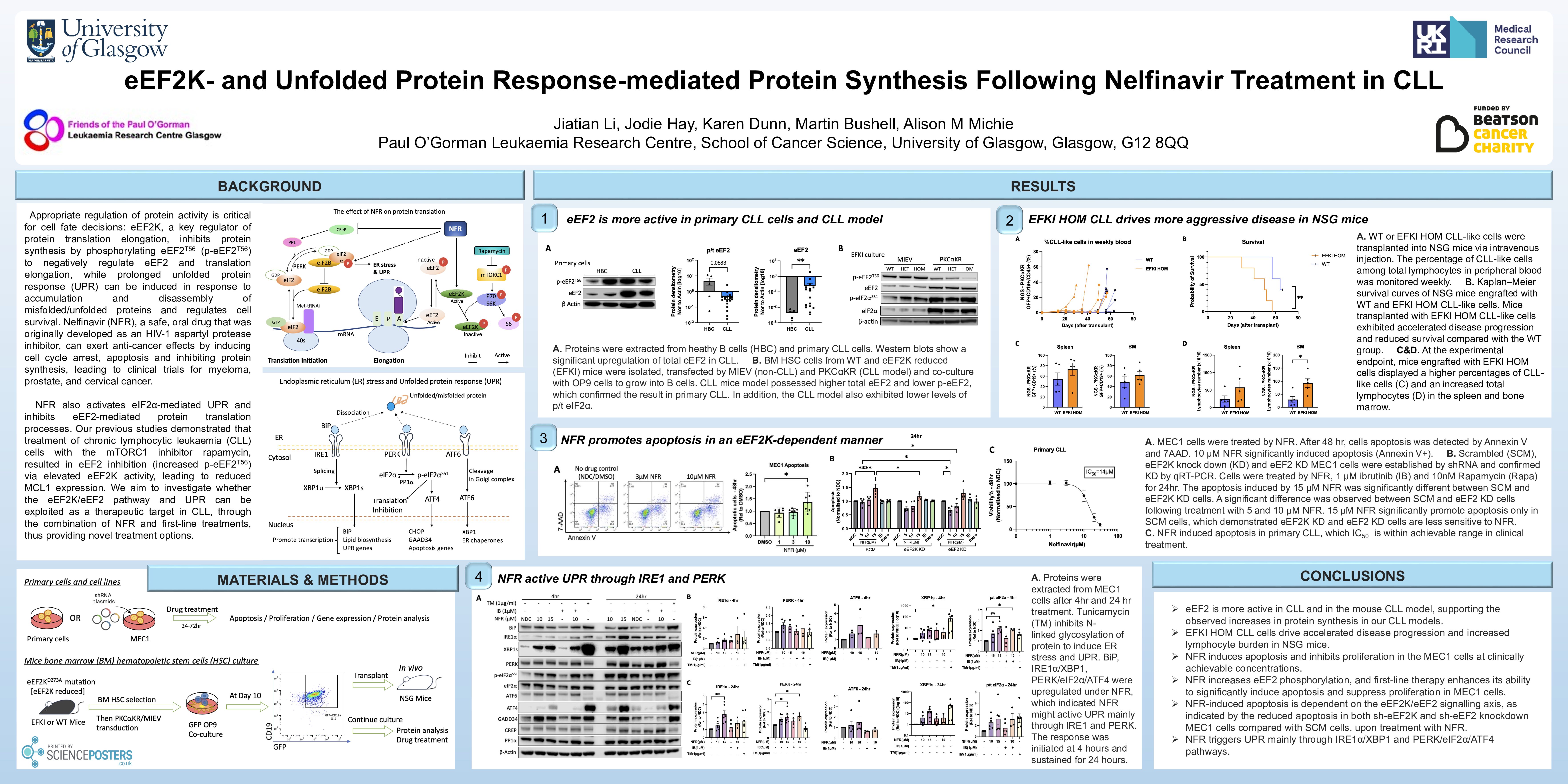 Appropriate regulation of protein synthesis is critical for cell fate decisions: eEF2K regulates cell survival through its phosphorylation of eEF2 T56 (p-eEF2 T56) to negatively regulate eEF2 and subsequently reduce translation elongation. Nelfinavir (NFR), a safe, oral drug that was originally developed as an HIV-1 aspartyl protease inhibitor, can exert anti-cancer effects by inducing cell cycle arrest, apoptosis and inhibiting protein synthesis. This has resulted in the inclusion of NFR in clinical trials for myeloma, prostate, and cervical cancer. NFR can also activate eEF2K, leading to an inhibition of eEF2-mediated protein translation. Our previous studies demonstrated that treatment of chronic lymphocytic leukaemia (CLL) cells with the mTORC1 inhibitor rapamycin, resulted in eEF2 inhibition (increased p-eEF2 T56) via elevated eEF2K activity, leading to reduced MCL1 expression. We aim to investigate whether the eEF2K/eEF2 pathway can be exploited as a therapeutic target in CLL, through the combination of NFR with first-line CLL treatments, thus providing novel treatment options.