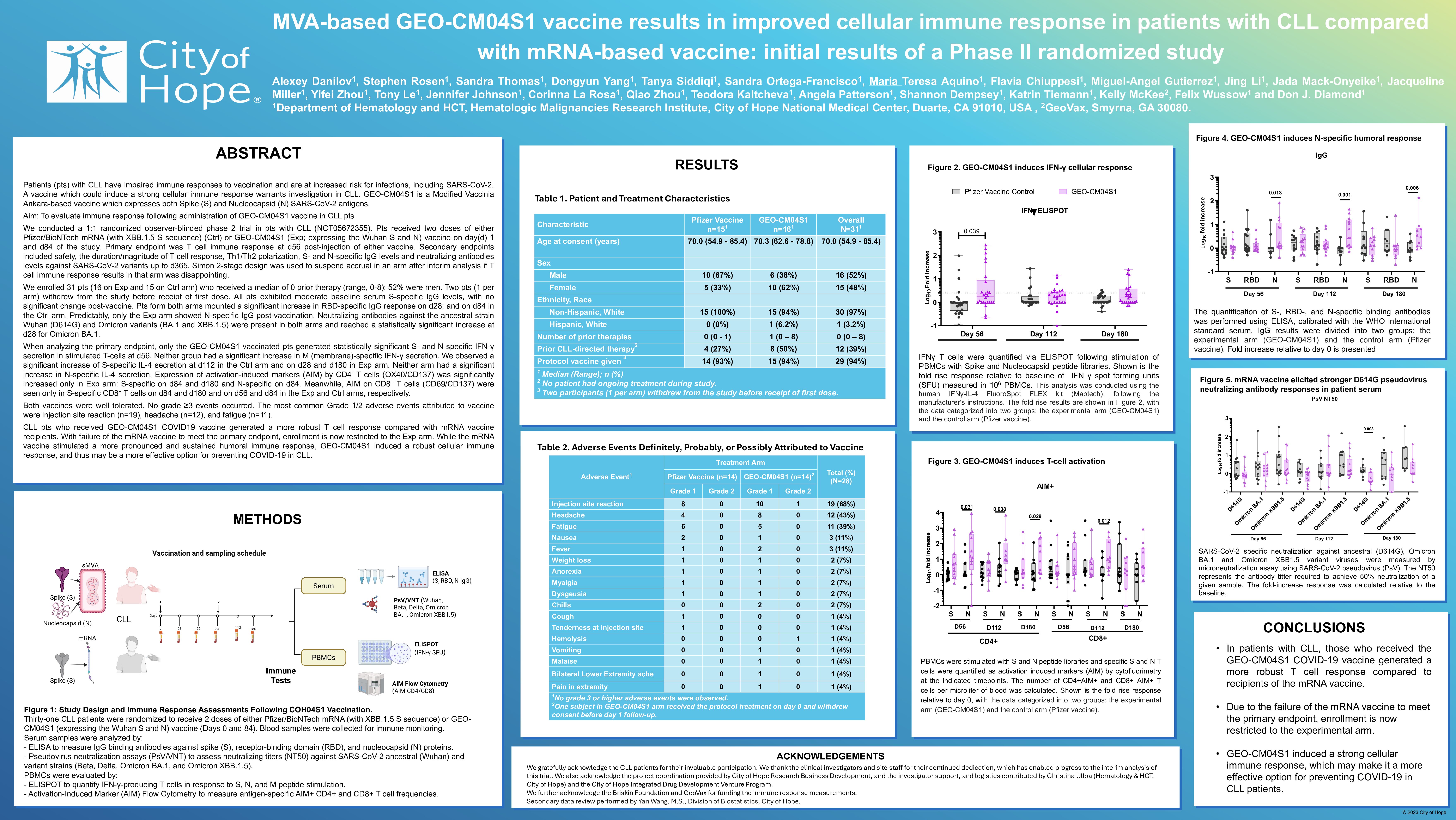 We conducted a 1:1 randomized observer-blinded phase 2 trial in pts with CLL (NCT05672355). Pts received two doses of either Pfizer/BioNTech mRNA (with XBB.1.5 S sequence) (Ctrl) or GEO-CM04S1 (Exp; expressing the Wuhan S and N) vaccine on day(d) 1 and d84 of the study. Primary endpoint was T cell immune response at d56 post-injection of either vaccine. Secondary endpoints included safety, the duration/magnitude of T cell response, Th1/Th2 polarization, S- and N-specific IgG levels and neutralizing antibodies levels against SARS-CoV-2 variants up to d365. Simon 2-stage design was used to suspend accrual in an arm after interim analysis if T cell immune response results in that arm was disappointing.