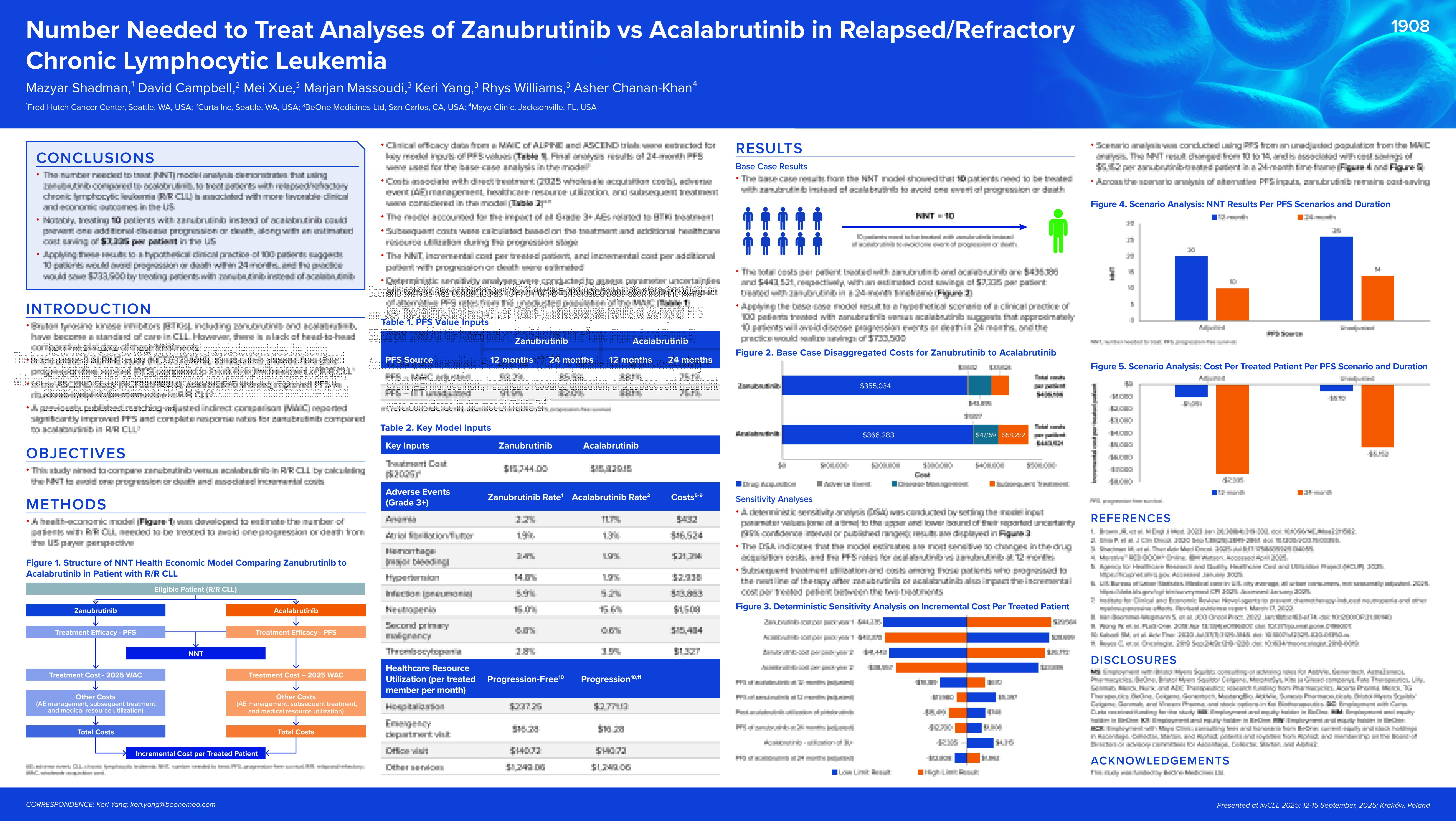 The NNT model analysis demonstrates that using zanubrutinib to treat R/R CLL patients, compared to acalabrutinib, is associated with more favorable clinical and economic outcomes in the US. Notably, zanubrutinib demonstrated a NNT of 10 to avoid one disease progression or death, along with an estimated cost saving of $7,335 per patient in the US.