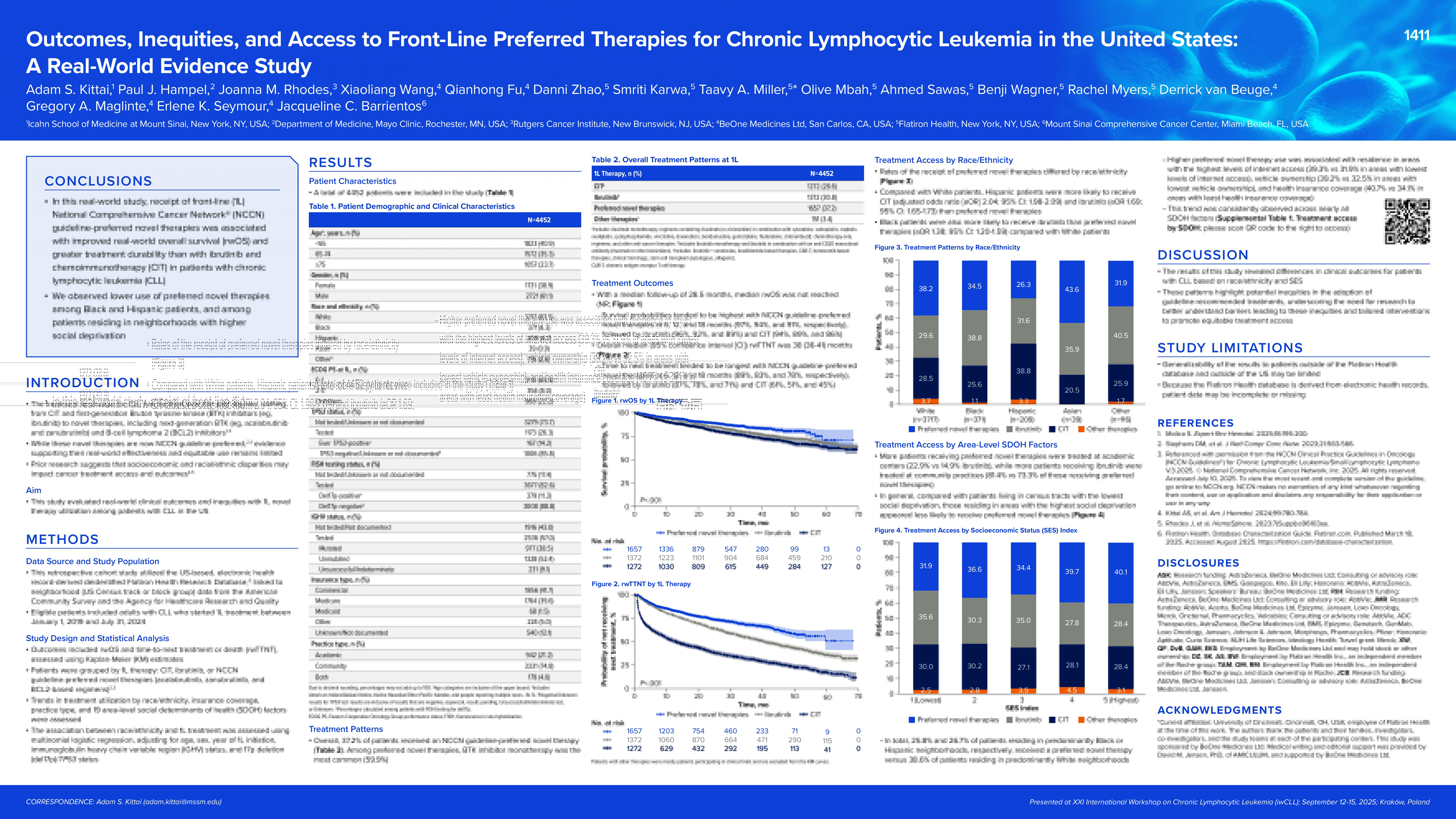 The treatment landscape for chronic lymphocytic leukemia (CLL) has evolved over the past decade, shifting from chemoimmunotherapy (CIT) and first-generation Bruton tyrosine kinase (BTK) inhibitors (eg, ibrutinib) to next-generation BTK and B-cell lymphoma 2 (BCL2) inhibitors. While these novel therapies (NTs) are now National Comprehensive Cancer Network® (NCCN) guideline–preferred, evidence supporting their real-world effectiveness and equitable use remains limited. Prior research suggests that socioeconomic and racial/ethnic disparities may impact cancer treatment access and outcomes. We evaluated real-world clinical outcomes and inequities with front-line (1L) NT utilization among patients with CLL in the US.