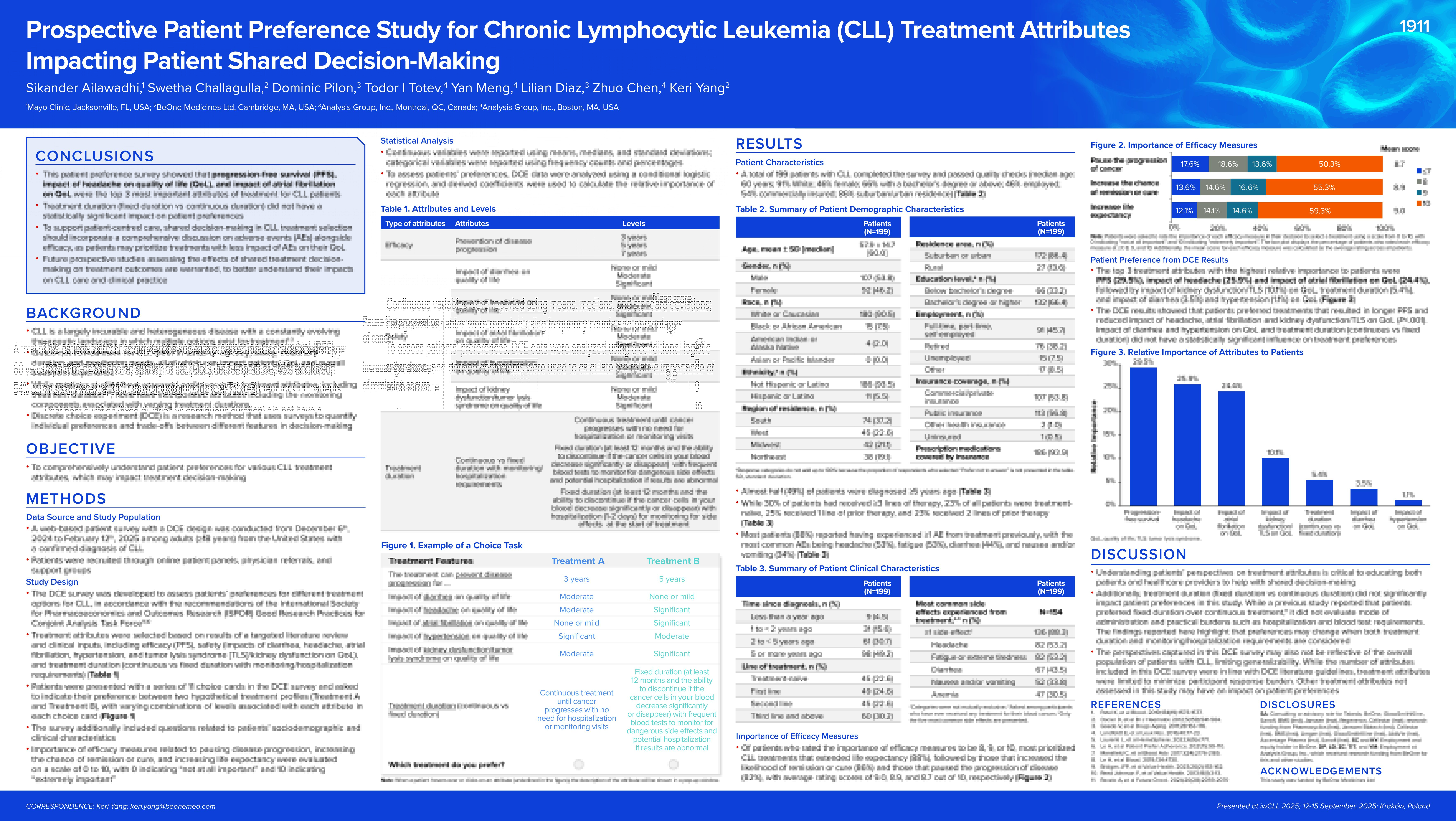 Treatments for CLL differ in efficacy, safety, treatment duration and monitoring needs, all of which can impact overall treatment experience and outcomes. To better understand patient preferences for various treatment attributes, a comprehensive quantitative analysis was conducted.