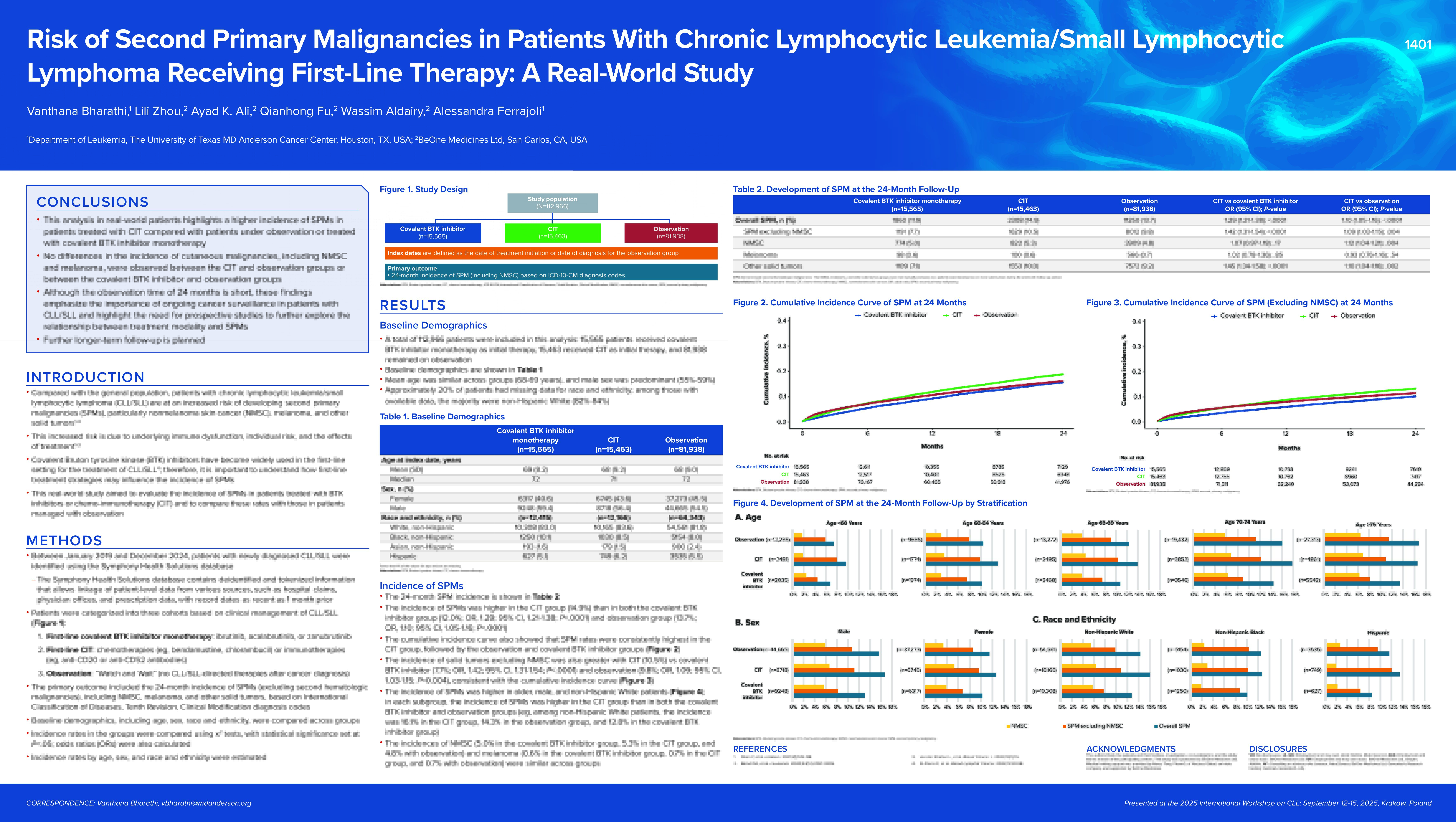 Between January 2019 and December 2024, patients with newly diagnosed CLL/SLL were identified using the Symphony Health Solutions database. Patients were categorized into three cohorts based on clinical management: (1) patients receiving first-line treatment with cBTKi monotherapy (ibrutinib, acalabrutinib, or zanubrutinib); (2) patients receiving first-line treatment with CIT; and (3) patients managed with observation. The index date was defined as the date of treatment initiation or date of diagnosis for the observation group. Outcomes included the 24-month incidence of SPM (including non-melanoma skin cancer (NMSC)) based on ICD-10-CM diagnosis codes. Baseline demographics, including age, gender, and race/ethnicity were compared across cohorts.
