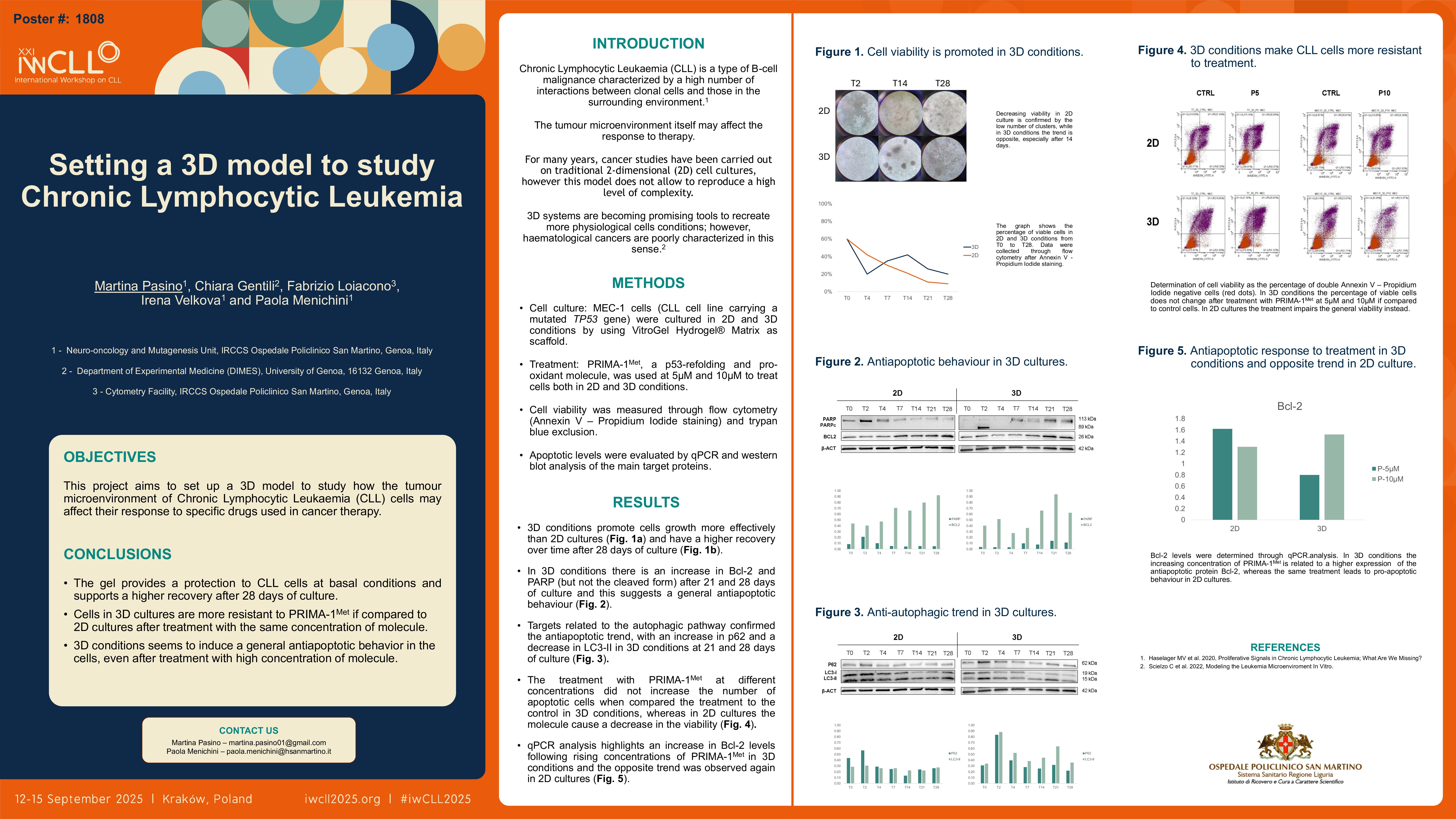 These preliminary results indicate that the gel seems to provide protection to CLL cells both in normal conditions and after treatment with PRIMA-1Met. This is probably related to the cell-scaffold interaction, which recreates a more physiological environment than 2D cultures. Based on these results, we will exploit this model to test new combinations of drugs already used in clinical practice to treat CLL. We will also apply this model to study primary CLL cells, aiming to enhance cell survival and assess the actual effects of various drugs under more physiological conditions.
