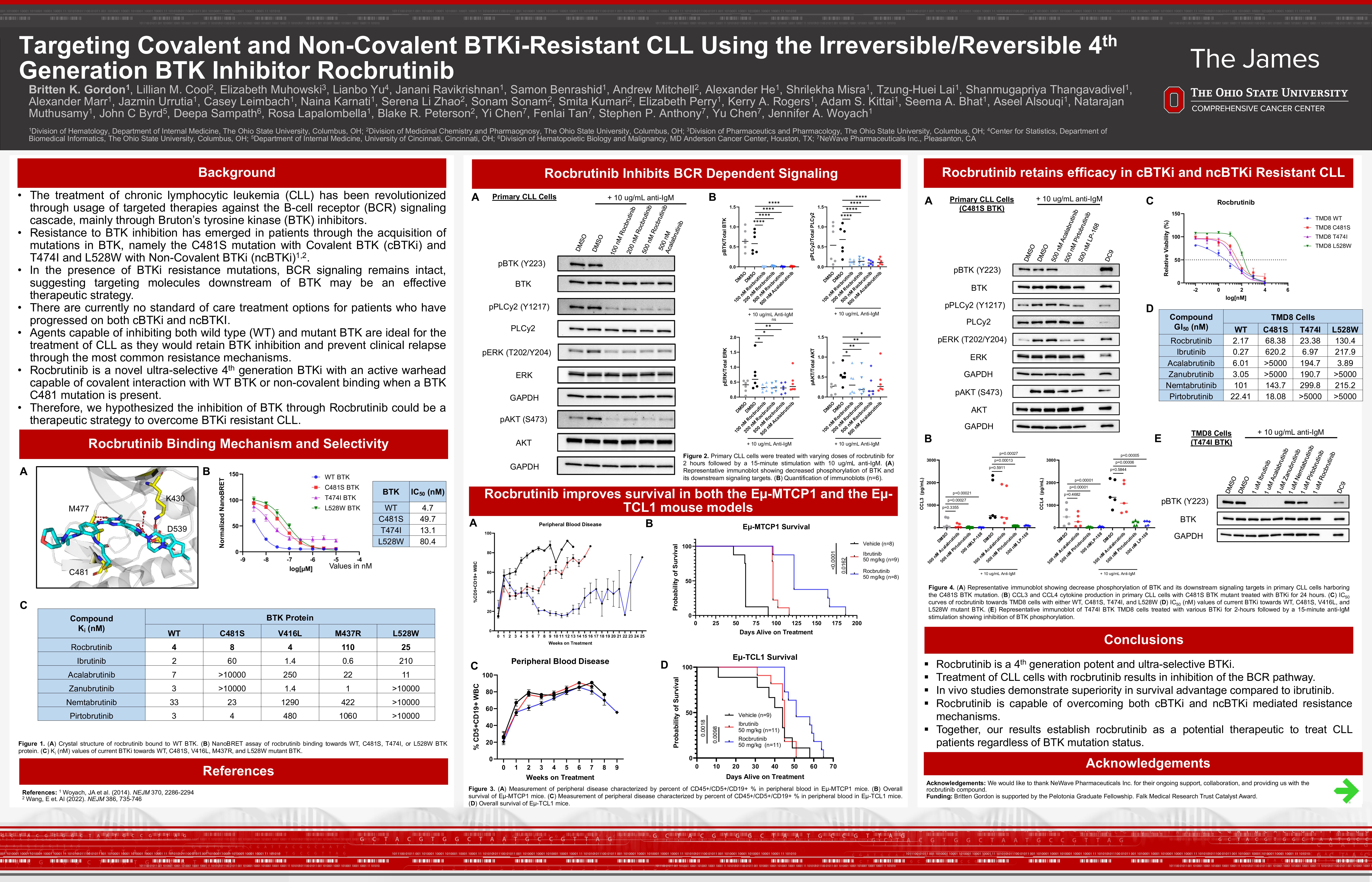 Treatment of chronic lymphocytic leukemia (CLL) has been transformed by targeted therapies including inhibitors of Bruton’s tyrosine kinase (BTKi). Currently three covalent BTKi (cBTKi) are approved for CLL, but most patients eventually relapse, commonly through acquisition of the C481S BTK mutation (Woyach et al., 2014). Non-covalent BTKi (ncBTKi), retain activity against C481 mutations but are susceptible to secondary BTK mutations (T474I, L528W, M427R, and V416L), which can also confer resistance to covalent BTKi (Wang et al., 2022). Regardless of these mutations, BCR signaling remains intact, suggesting that inhibition of the BCR pathway retains its therapeutic importance. Agents capable of targeting and inhibiting both wild-type (WT) and mutant BTK (C481S, T474I, and L528W) are ideal for treating CLL as they would retain BTK inhibition and prevent clinical relapse through the most common resistance mechanisms. Rocbrutinib is a novel selective 4th generation BTKi with an active warhead capable of binding WT and mutant BTK.