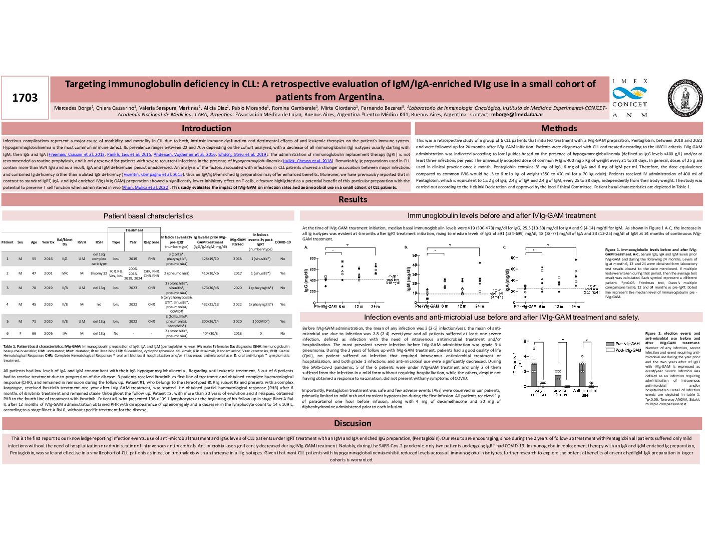 Infectious complications represent a major cause of morbidity and mortality in CLL due to both, intrinsic immune dysfunction and detrimental effects of anti-leukemic therapies on the patient´s immune system. Hypogammaglobulinemia is the most common immune defect. Its prevalence ranges between 20 and 70% depending on the cohort analysed, with a decrease of all immunoglobulin (Ig) isotypes usually starting with IgM, then IgG and IgA (Freeman, Crassini et al. 2013, Parikh, Leis et al. 2015, Andersen, Vojdeman et al. 2016, Ishdorj, Streu et al. 2019). The administration of immunoglobulin replacement therapy (IgRT) is not recommended as routine prophylaxis, and is only reserved for patients with severe recurrent infections in the presence of hypogammaglobulinemia (Hallek, Cheson et al. 2018). Remarkably, Ig preparations used in CLL contain more than 95% IgG and as a result, IgA and IgM deficiencies persist unaddressed. An analysis of the factors associated with infections in CLL patients showed a stronger association between major infections and combined Ig deficiency rather than isolated IgG deficiency (Visentin, Compagno et al. 2015), thus an enriched Ig preparation may offer enhanced benefits. Moreover, we have previsoulsy reported that in contrast to standard IgRT, IgA- and IgM-enriched IVIg (IVIg-GAM) preparation showed a significantly lower inhibitory effect on T cells, a feature highlighted as a potential benefit of this particular preparation with the potential to preserve T cell function when administered in vivo (Khan, Molica et al. 2022). This study evaluates the impact of IVIg-GAM on infection rates and antimicrobial use in a small cohort of CLL patients.
